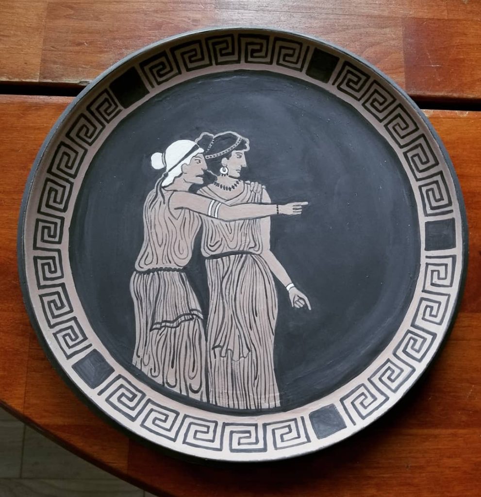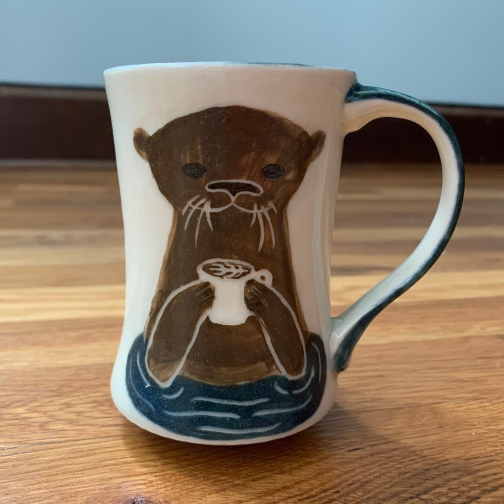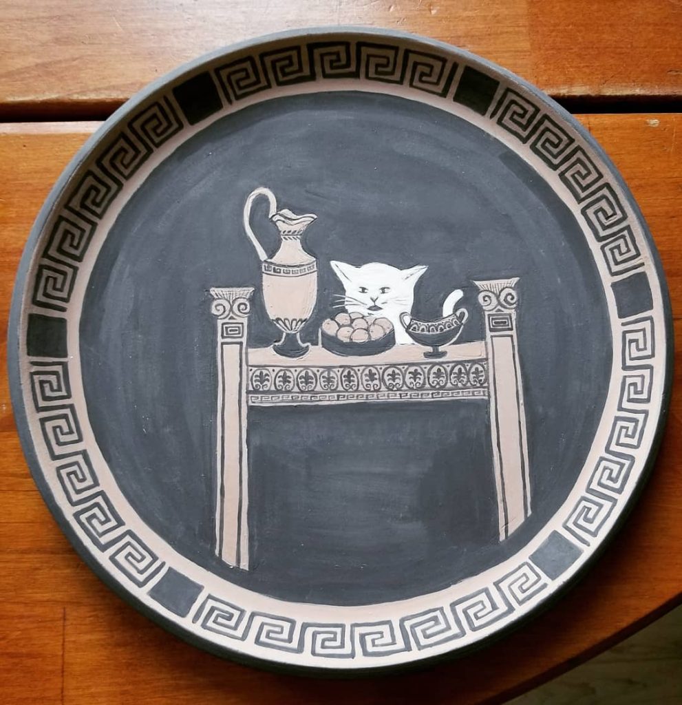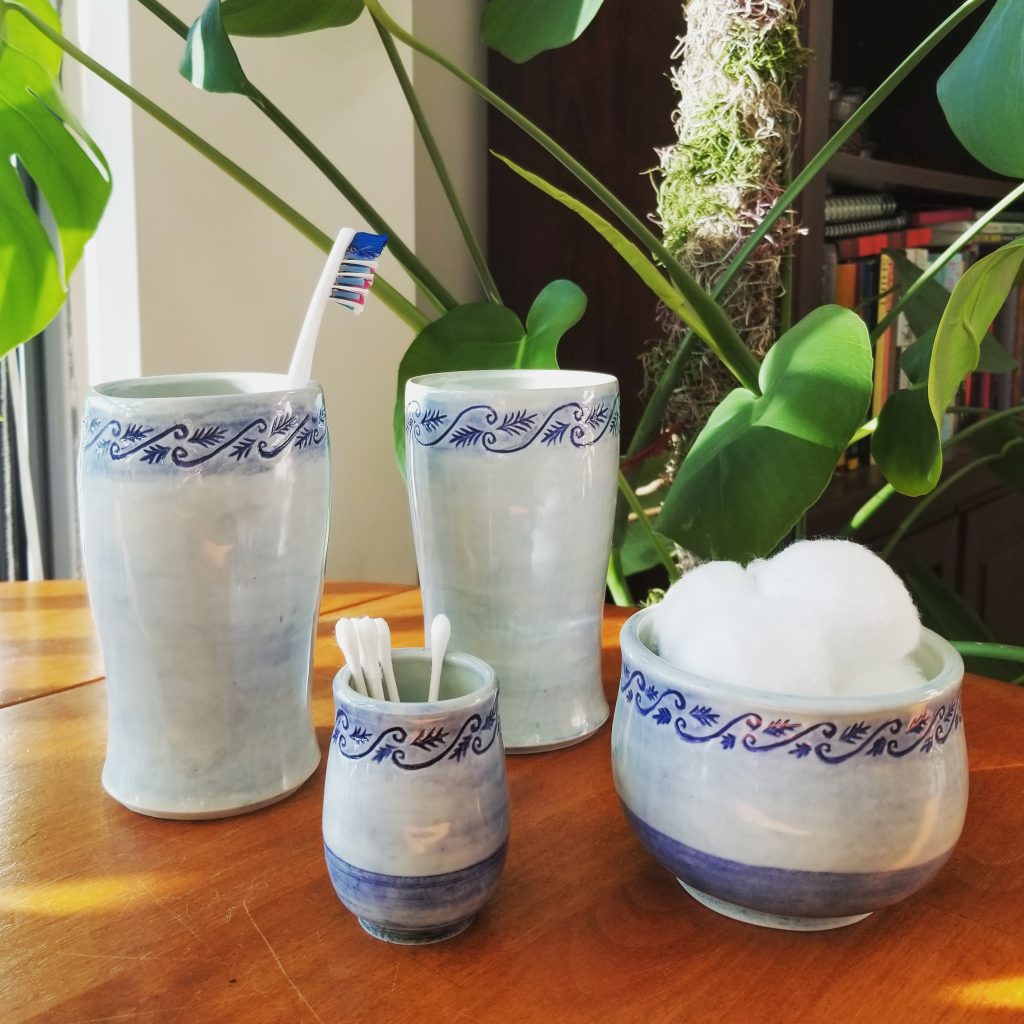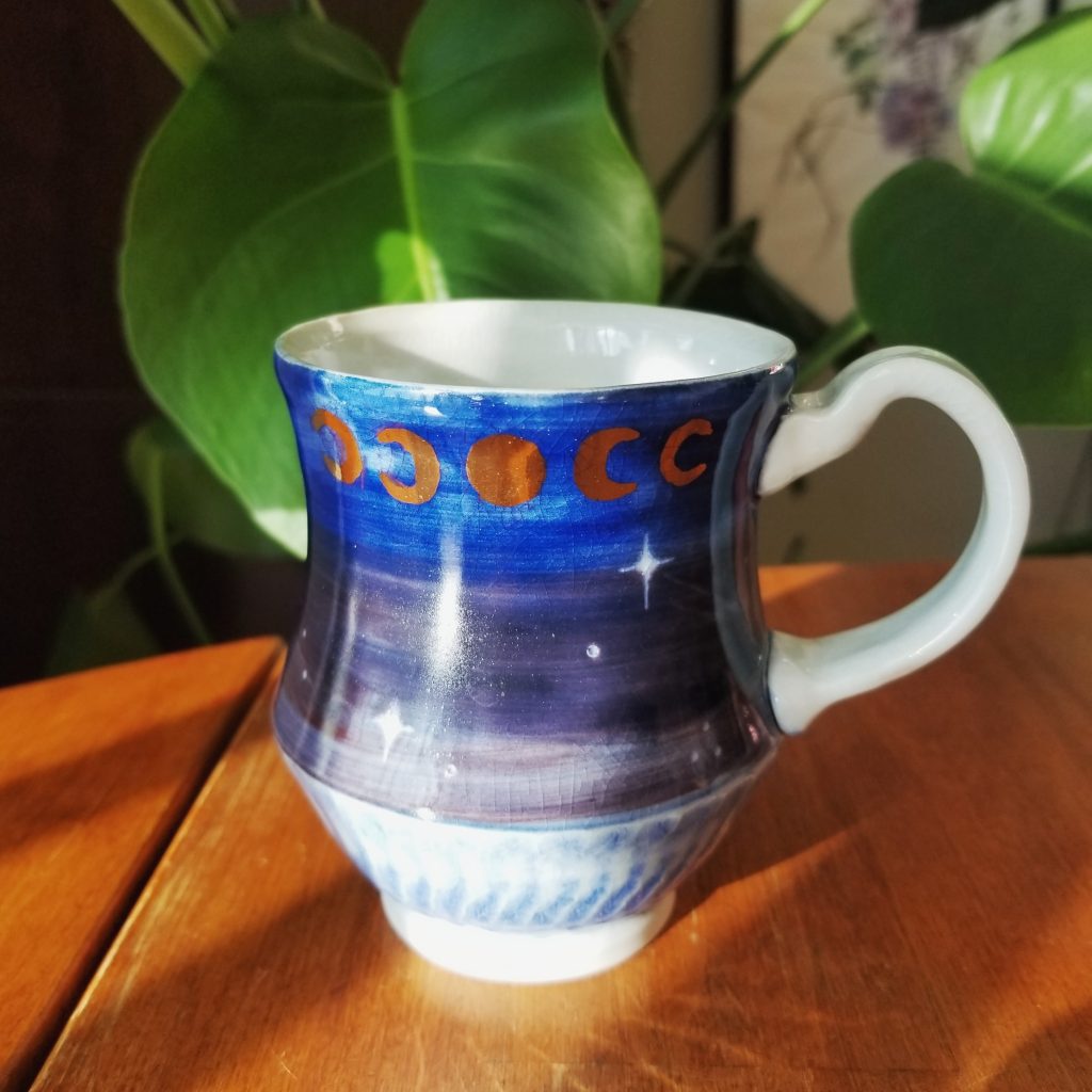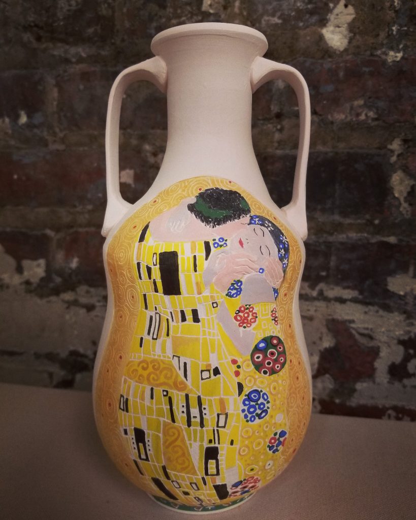 Der Kuss, handpainted underglaze and Gustin’s Shino Cone 10 Gas Reduction FiredArt Nouveau Daffodil Vase, Porcelain & UnderglazeGreenhouse Mugs, handpainted underglaze on porcelain Cone 10 reduction fired gas kiln Ancient Greek Palmet hand painted with underglaze, Porcelain with Gustin’s Shino fired Cone 10 reduction gas kiln