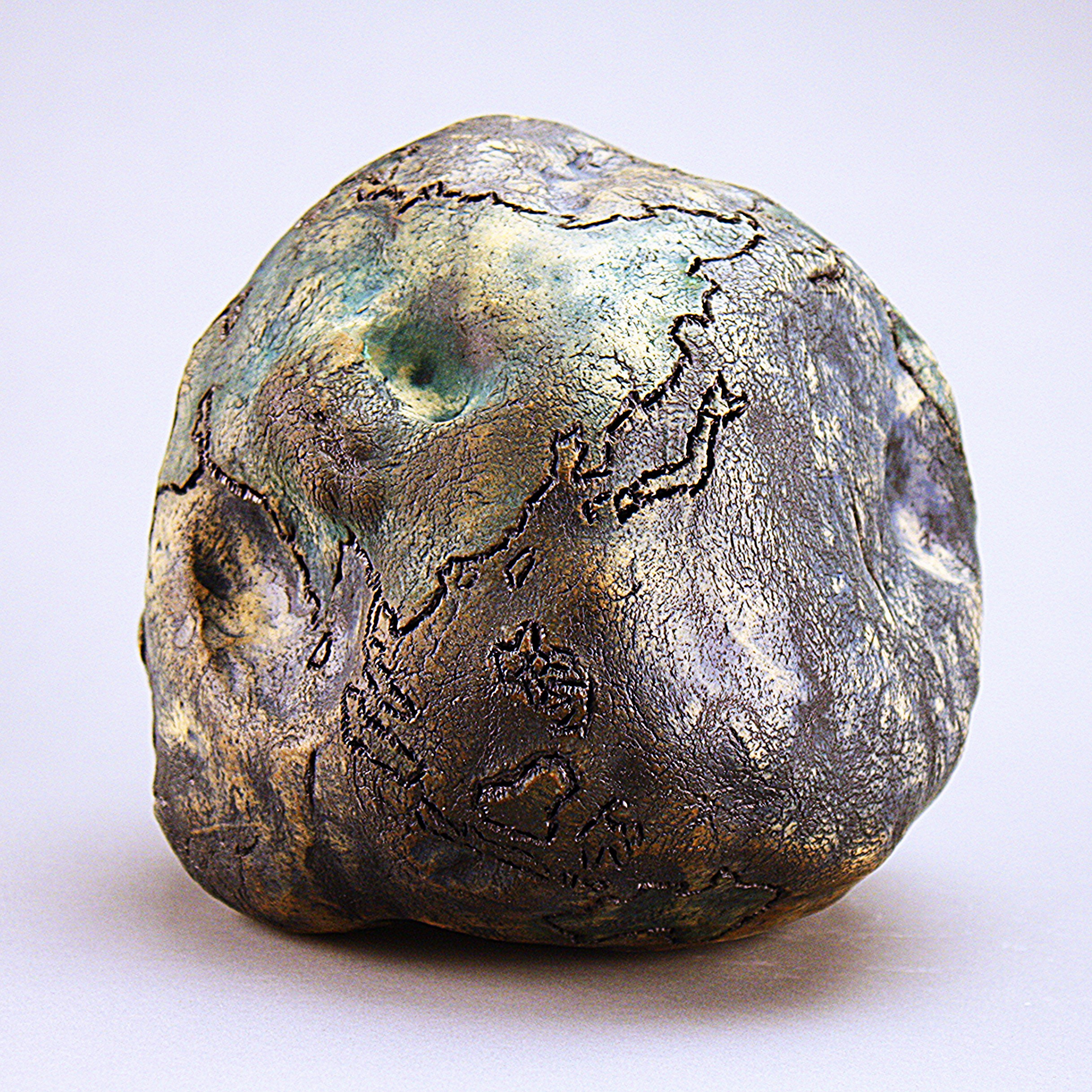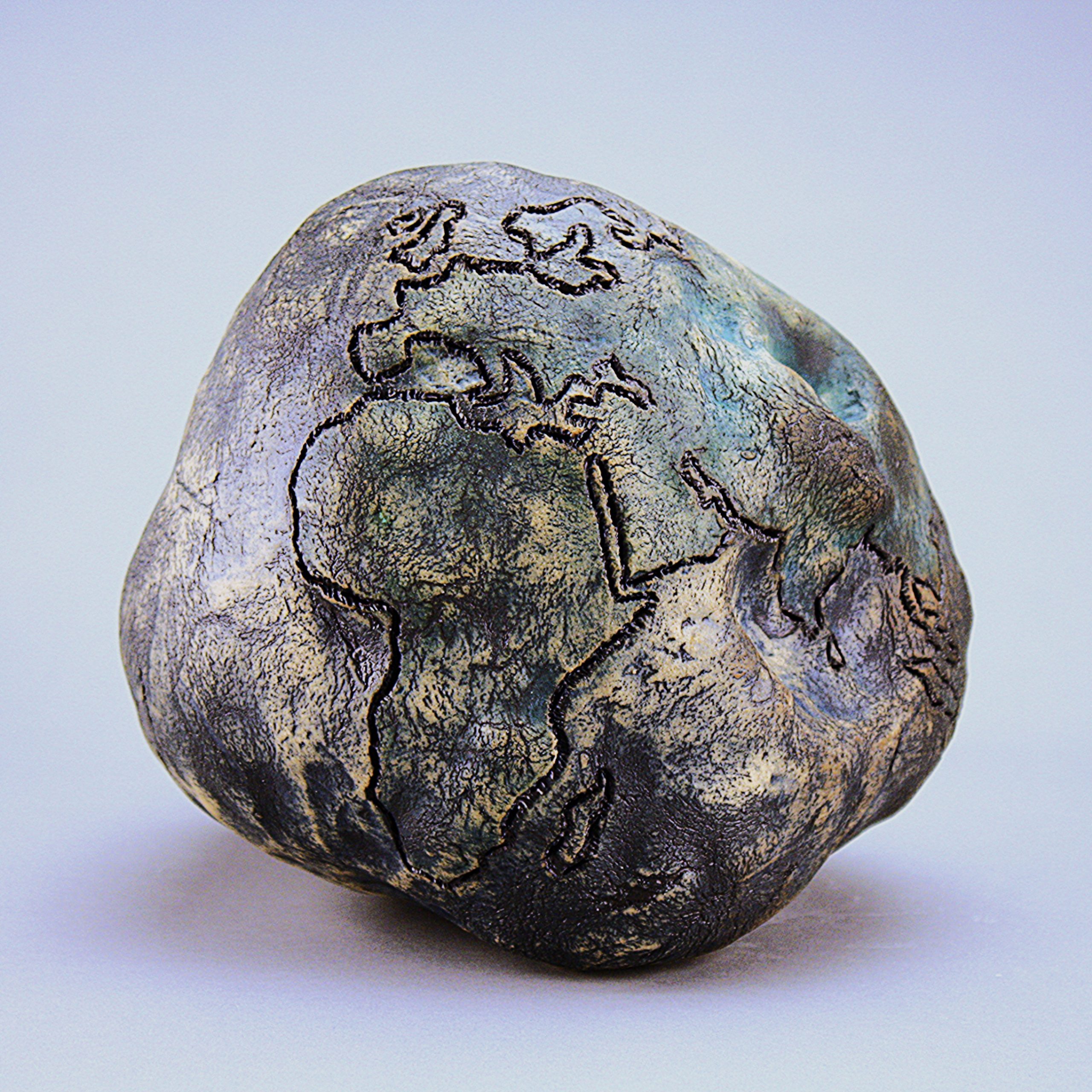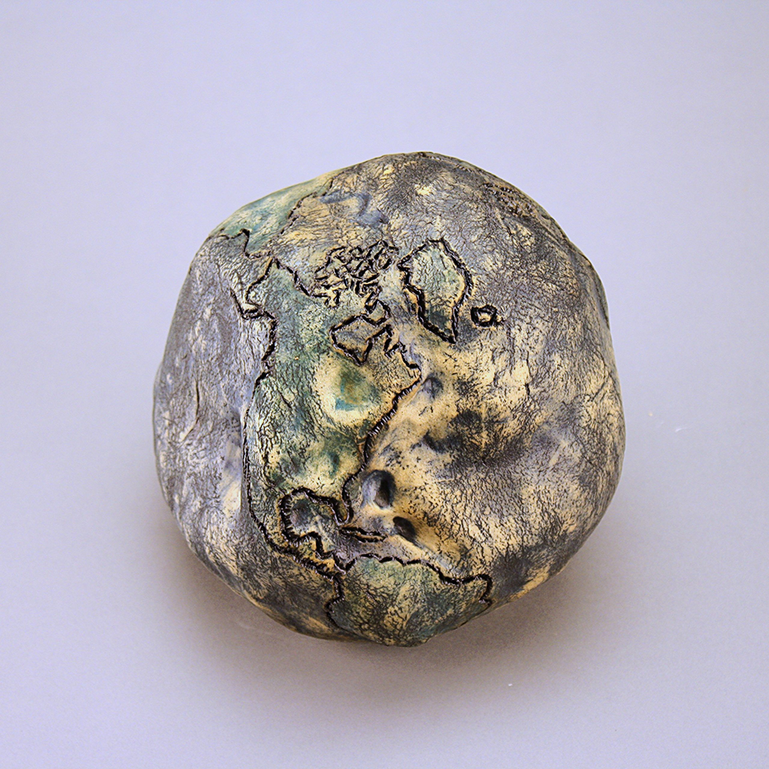 The Geoid Sculptures displayed for critique, second hand wooden stand refinished in grey and black space. Gravity Geoid, 2012. Stoneware and glaze, fired cone 10 reduction & wire added after firingGeoid Fruit Platter, 2012. Stoneware and Glaze fired to cone 10Pinch Geoid, 2012. Stoneware and mason stain washClimate Change Geoid, 2012. Collapsed Geoid, wood fired and placed in a dish with oil leaking from the cracks of the cracked container