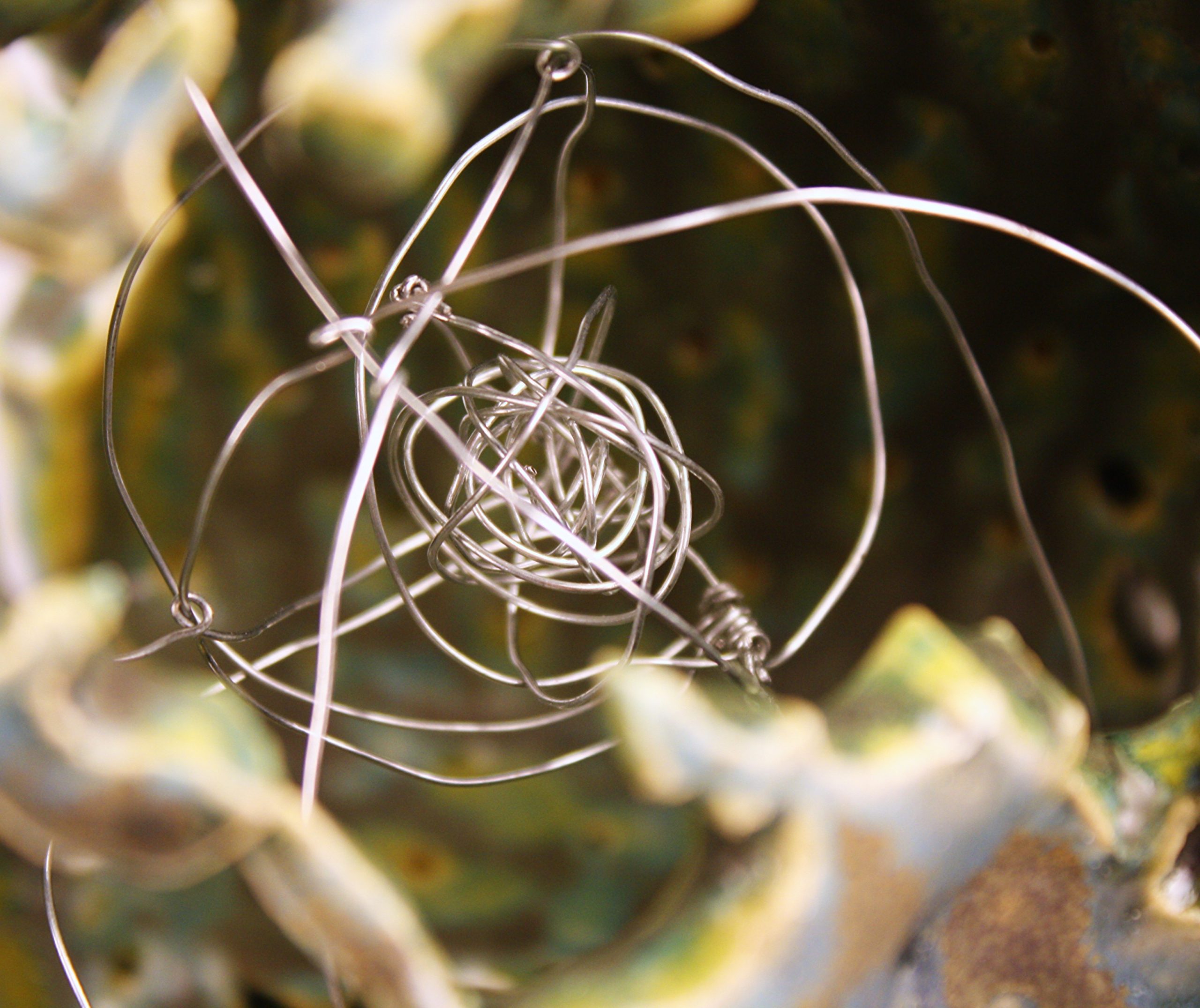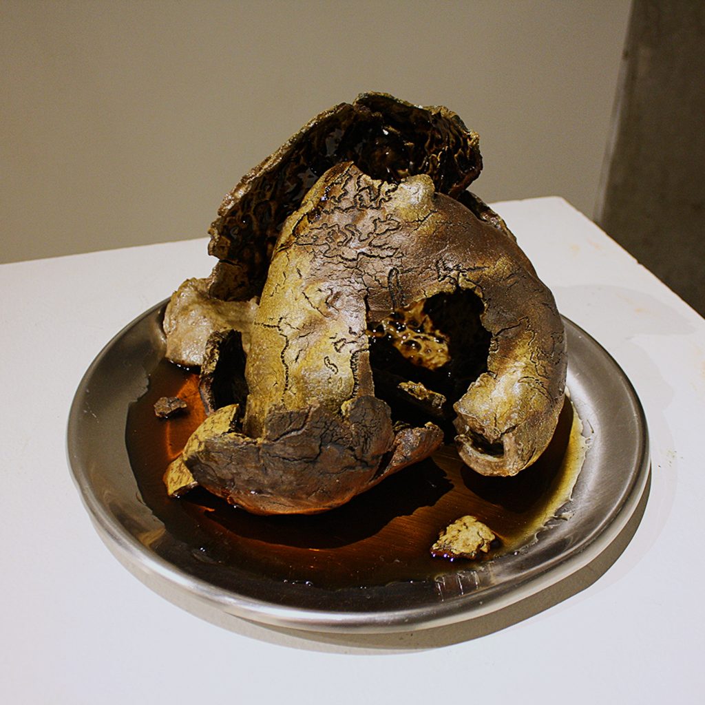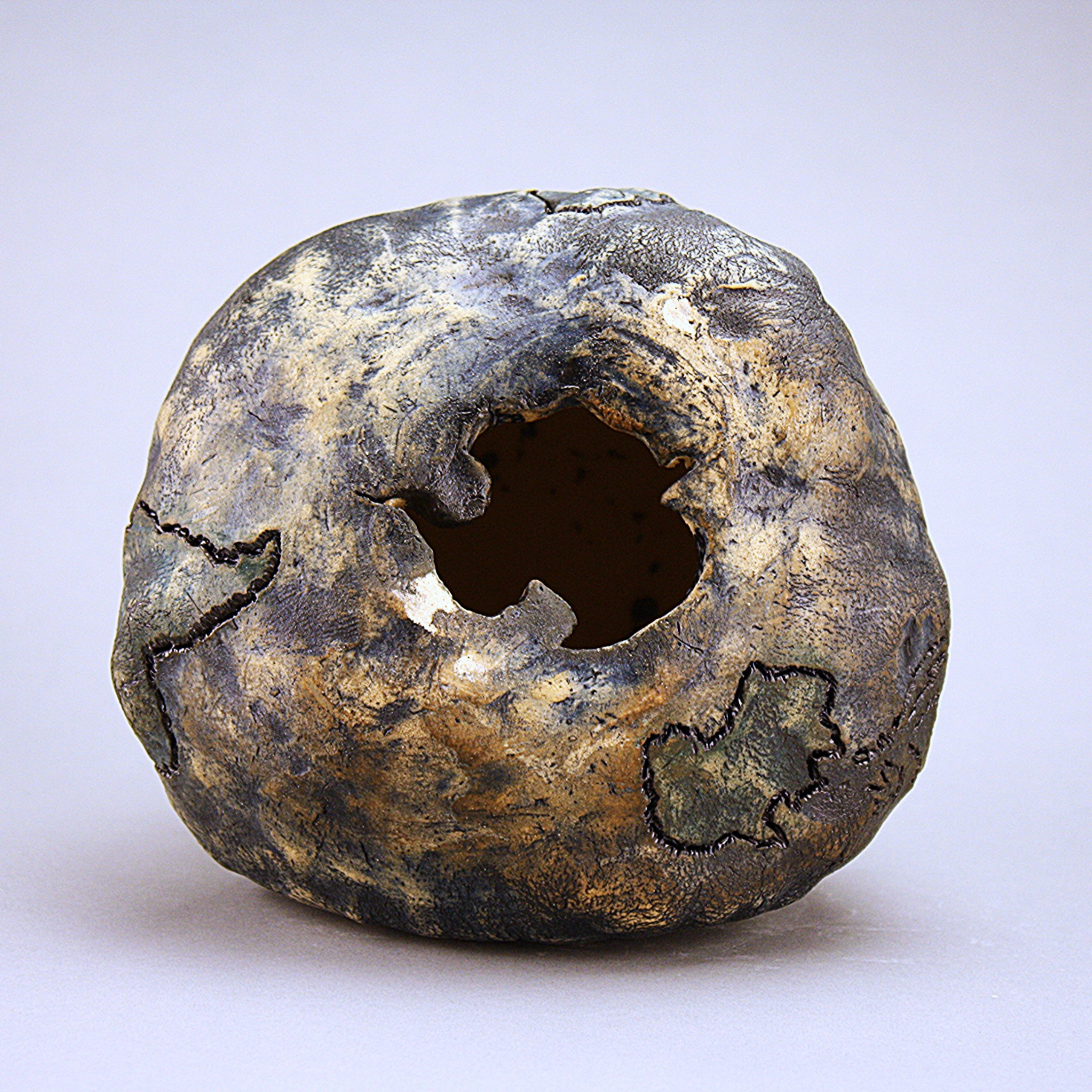 The Geoid Sculptures displayed for critique, second hand wooden stand refinished in grey and black space. Gravity Geoid, 2012. Stoneware and glaze, fired cone 10 reduction & wire added after firingGeoid Fruit Platter, 2012. Stoneware and Glaze fired to cone 10Pinch Geoid, 2012. Stoneware and mason stain washClimate Change Geoid, 2012. Collapsed Geoid, wood fired and placed in a dish with oil leaking from the cracks of the cracked container